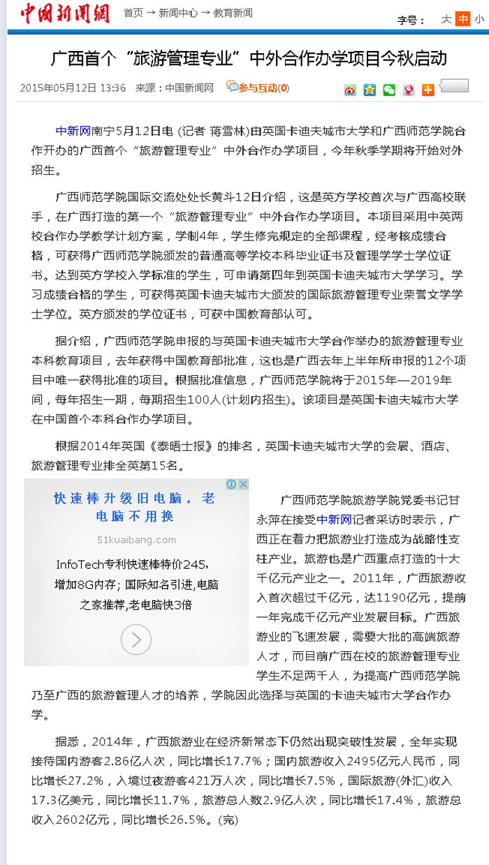 中新网、人民网等多家媒体报道我校首个“旅游管理专业”中外...