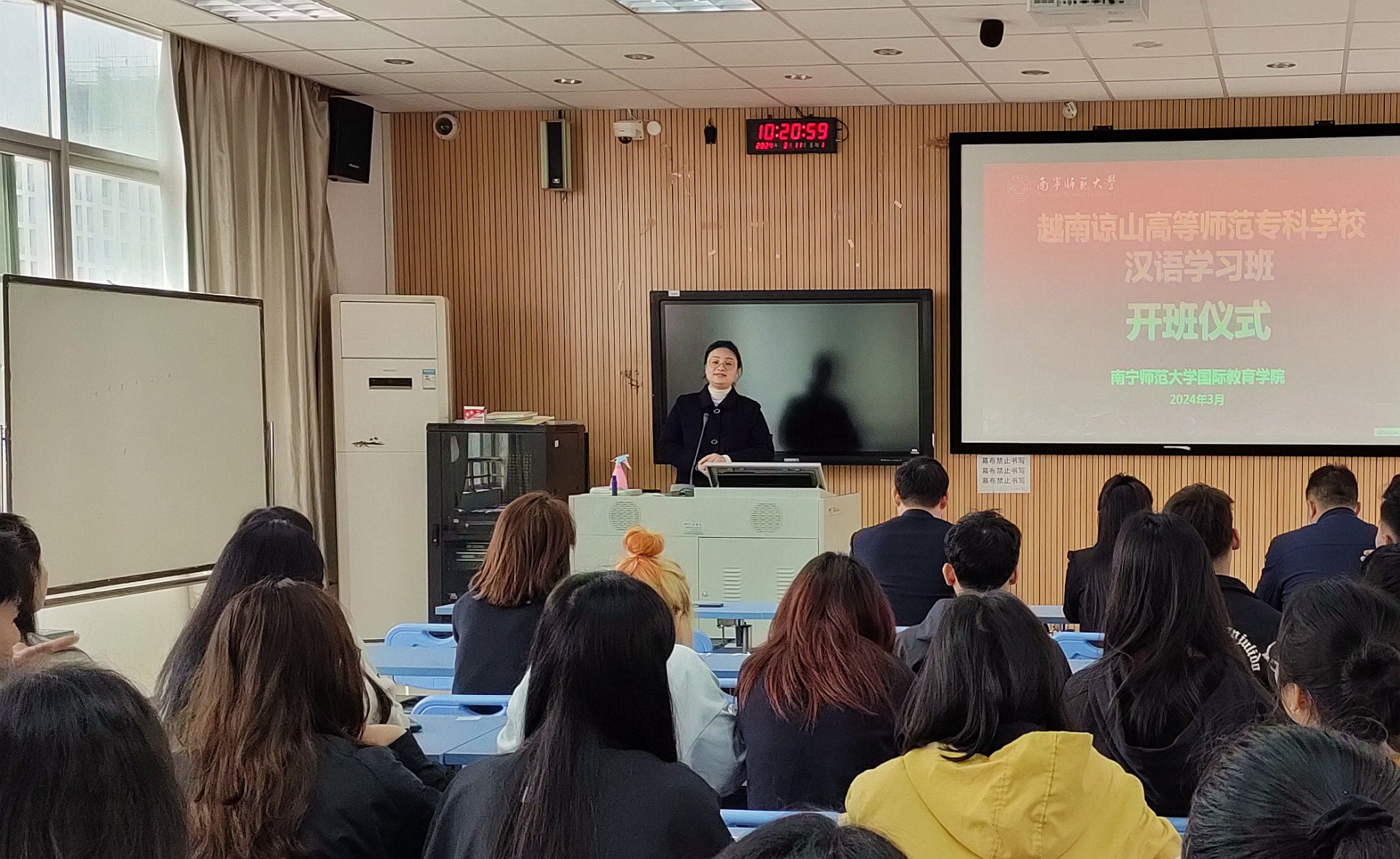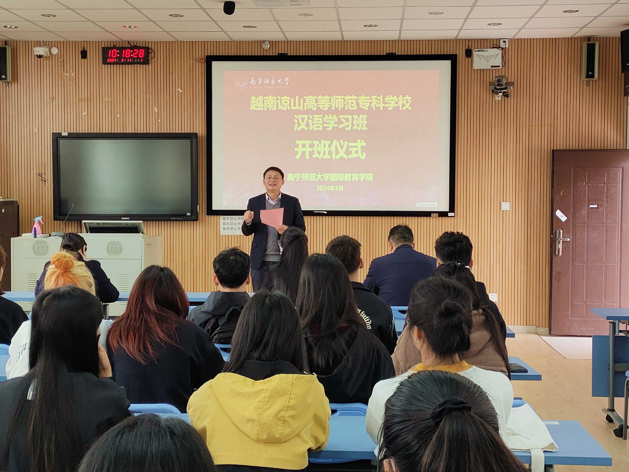 3月11日,阳光明媚,春风和煦,国际教育学院在五合校区综合楼411迎来了一场特别的开班仪式——越南谅山高等师范学校汉语学习班正式开班。出席此次开班仪式的领导和嘉宾有国际交流合作处处长、国际教育学院院长杨绪明、文学院党委书记旷晓霞、国际交流合作处教师蔡立超,以及来自越南谅山高等师范学校的李氏兰老师和52名越南留学生。