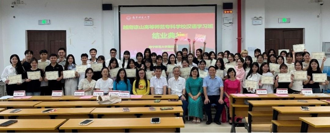 6月3日下午,国际教育学院在五合校区文综楼1001教室举行越南谅山高等师范学校短期汉语学习班结业典礼。此次典礼荣幸邀请到了我校肖琦副校长,以及来自越南谅山高等师范学校阮世杨副校长、国际交流合作处黎氏明诗处长、财务处阮氏金处长,还有众多外语系教师,以及我校国际教育学院院长助理徐伟杰先生共襄盛举。典礼由国际交流合作处处长、国际教育学院院长杨绪明主持。
