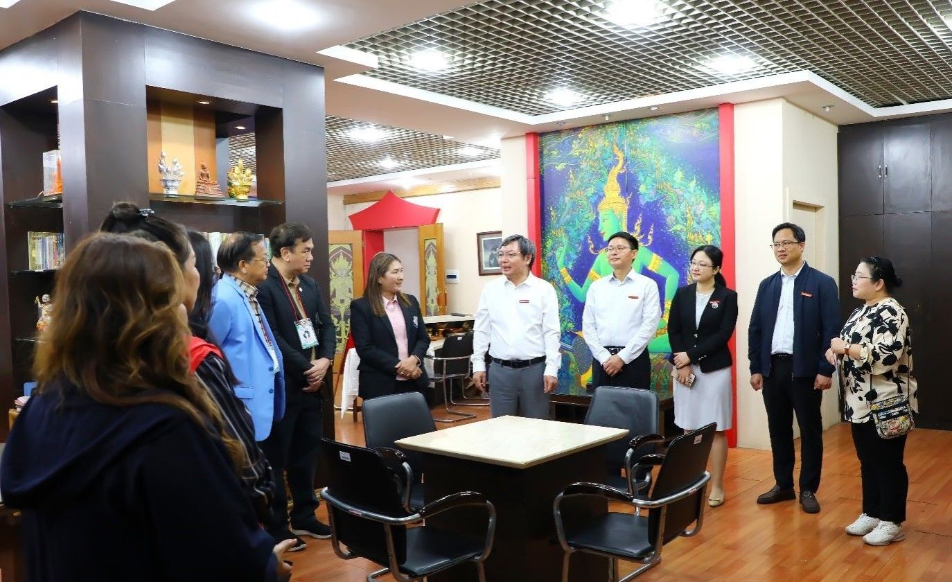 11月5日上午,泰国暖武里府玫瑰园中学CHAROONJARUSAN校长一行11人到我校交流访问。学校李传起校长、国际交流合作处/国际教育学院相关负责人及工作人员在明秀校区泰语中心接待了泰国代表团一行。李传起校长对代表团的来访表示热烈欢迎,介绍了学校的基本情况和教育对外开放发展取得的新成绩,希望通过此次会面,双方互相了解,建立友好合作关系。泰国暖武里府玫瑰园中学CHAROONJARUSAN校长对我校的热情接待表示感谢,表达了两校教育发展、合作共赢的愿景。