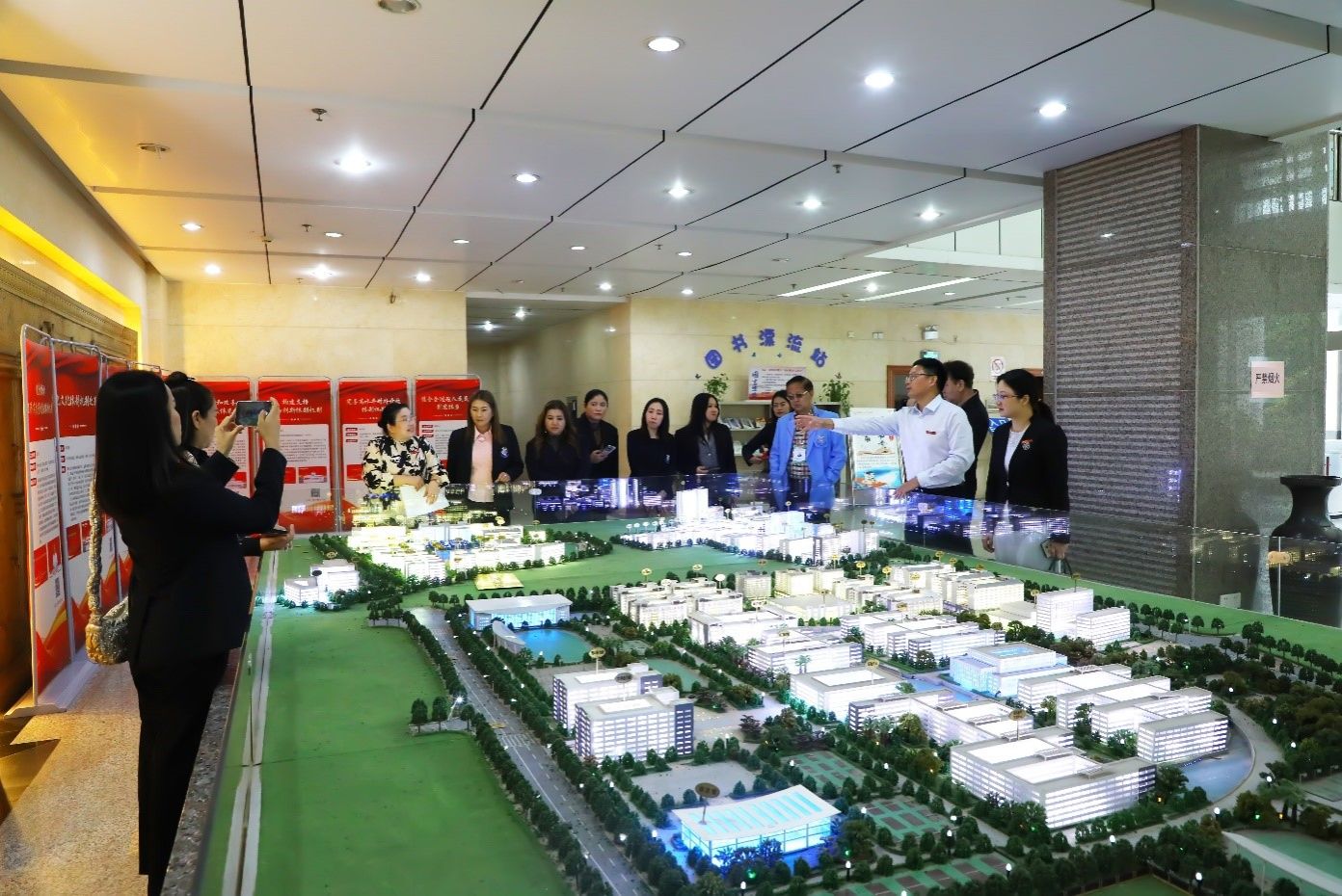 座谈会前,国际交流合作处/国际教育学院相关负责人陪同代表团参观了学校沙盘、教师教育展。