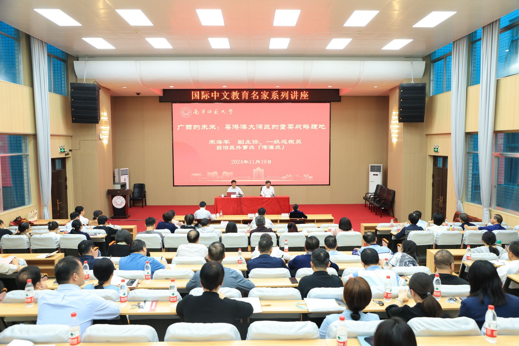 为深入贯彻落实习近平总书记关于把广西打造成为粤港澳大湾区重要战略腹地的重要指示精神,2024年11月19日下午,我校邀请自治区外事办公室(港澳事务办公室)宋海军副主任、一级巡视员,在明秀校区文星楼301报告厅作“广西的未来:粤港澳大湾区的重要战略腹地”专题报告。报告会由李传起校长主持,学校肖琦副校长、龙妮娜副校长,全体中层干部、有留学生的学院相关教育管理人员、国际教育学院学生代表共200余人参加。