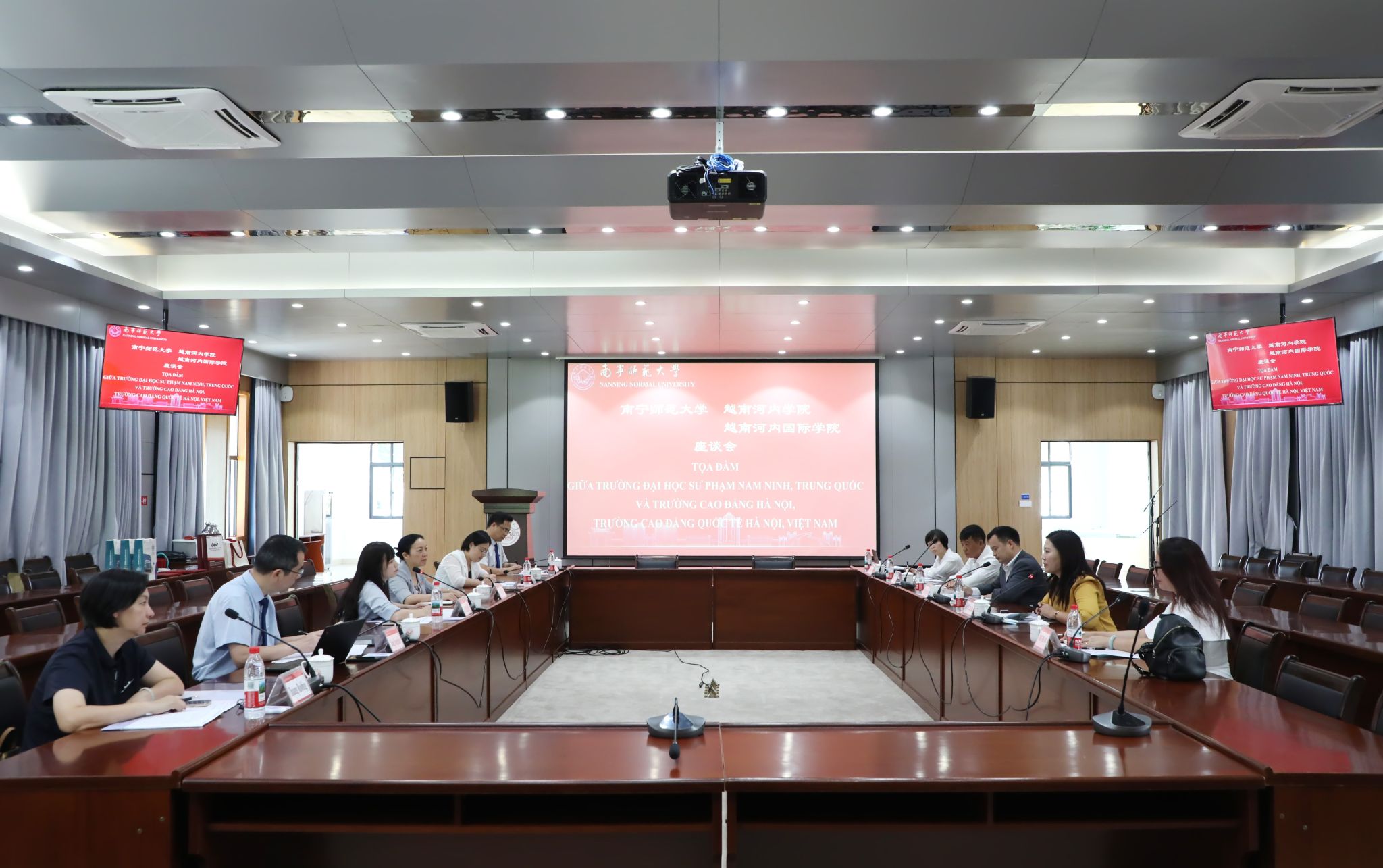 龙妮娜副校长对代表团的来访表示热烈欢迎。她简要介绍了学校近年来各项事业发展情况,特别是教育对外开放取得的新成就。她指出,中越两国是山水相连的社会主义邻邦,今年正值中越建交75周年,也是“中越人文交流年”。我校作为广西C9高校,兼具师范与非师范学科的显著优势,拥有丰富的对外交流经验,尤其是与越南教育交流的深厚基础,以及多个特色鲜明的校区,是越南高校开展教育合作的理想伙伴。希望两校借助东盟博览会这一平台,以“中越人文交流年”为契机,建立教育合作关系,共同提升教育国际交流与合作水平,为构建具有战略意义的中越命运共同体贡献力量。