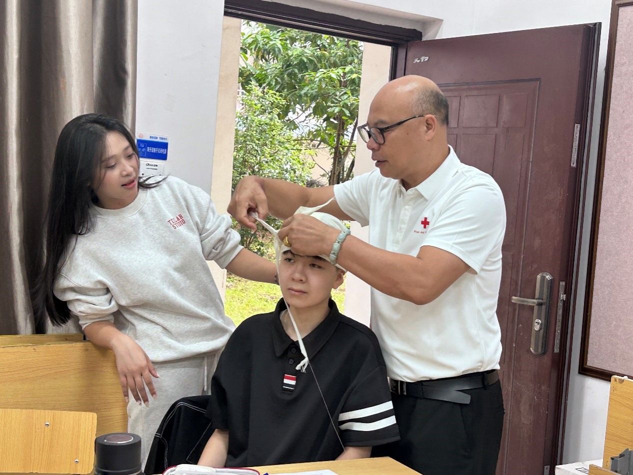 实操训练环节气氛热烈、互动频繁。在心肺复苏练习中,学员们分组在模拟人上进行按压与人工通气练习,教师逐一纠正动作,强调“手臂垂直、频率达标”。创伤救护课上,学员们两人一组,互相扮演伤员与施救者,认真练习头部包扎、手臂固定等技能。来自越南的学员在教师指导下反复调整绷带松紧,力求操作规范、有效。整个培训过程紧张有序,充满活力。
