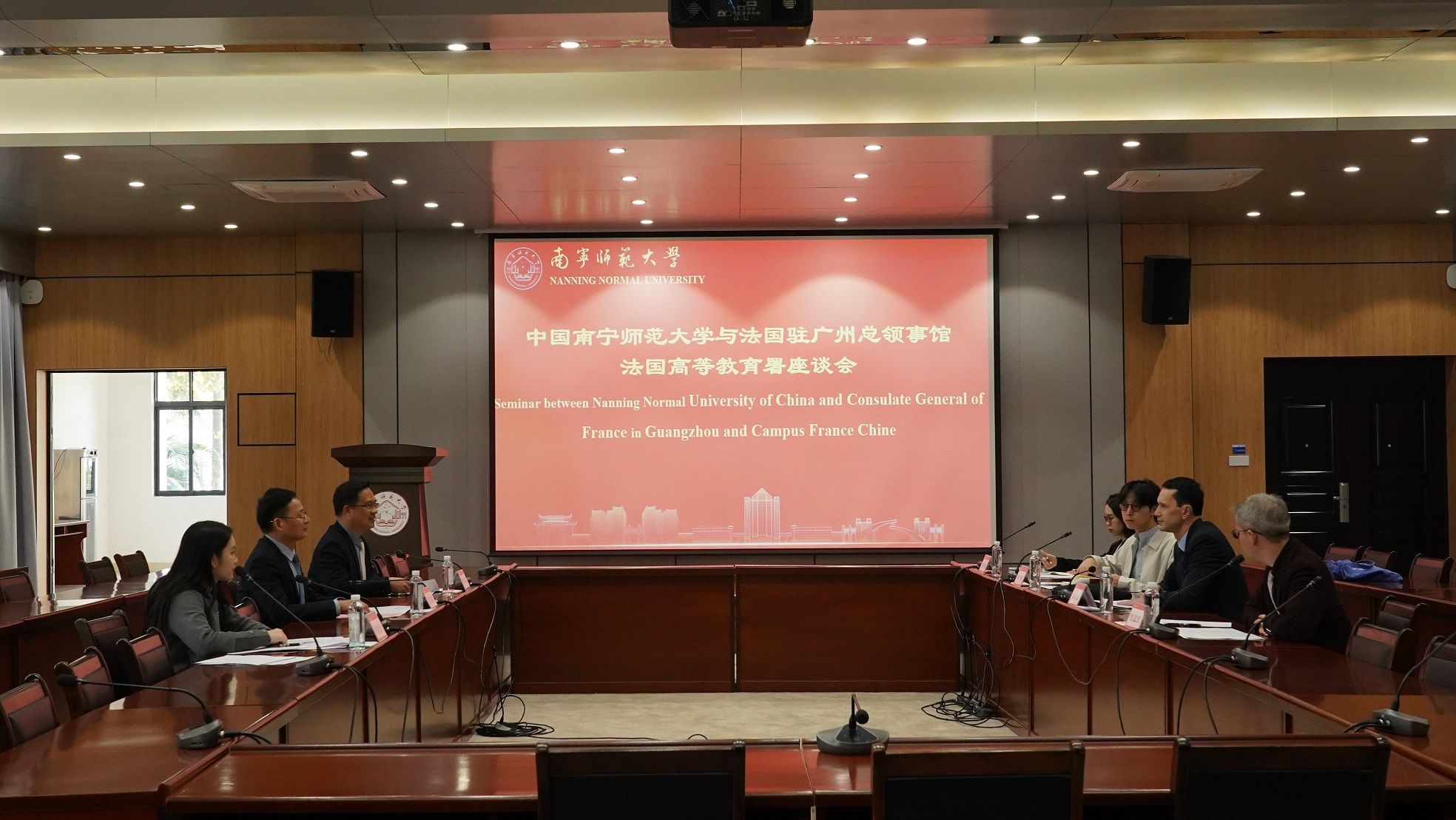 12月10日下午,法国驻广州总领事馆科技与高等教育合作领事敖礼威一行4人到我校访问,我校国际交流合作处处长/国际教育学院院长杨绪明及相关人员在武鸣校区行政楼北127会议室接待了领事一行,并召开座谈会。